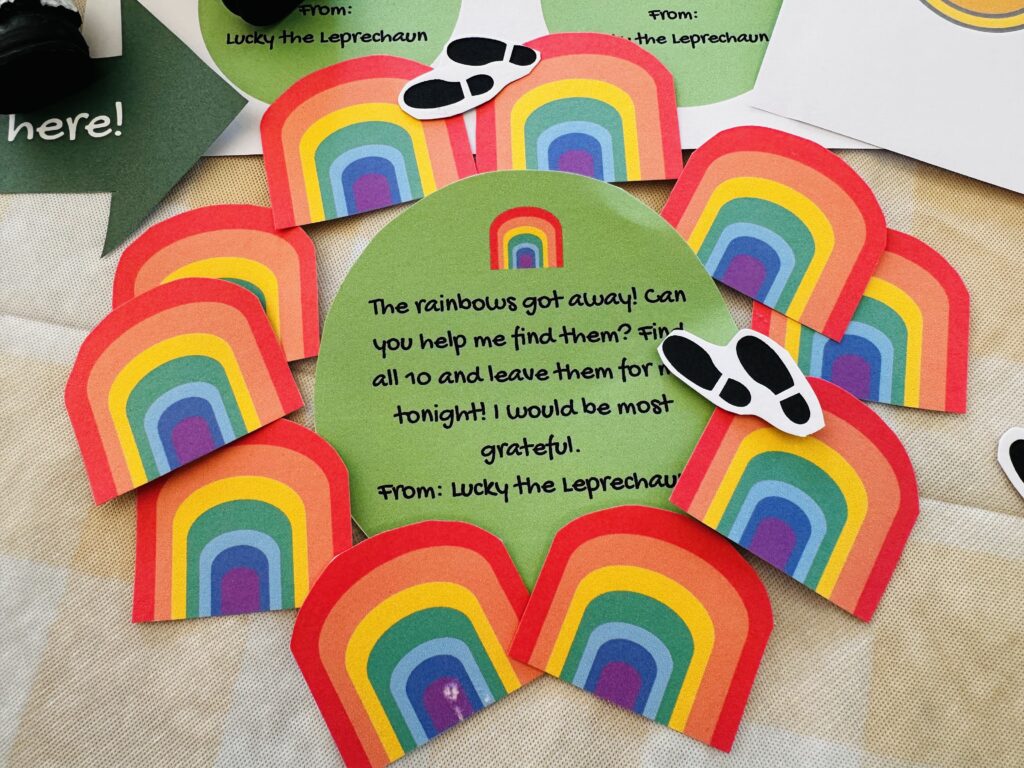 - Go on a Rainbow Hunt! Cut out a few paper rainbows and hide them around your house for your kids to find. You can turn it into a mini scavenger hunt or leave a small prize at the end — maybe a chocolate coin or a lucky treat.